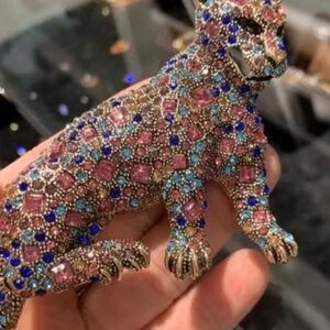 This gorgeous panther brooch is set with multi colored gem stones in the pink & blue hue range; light catches the gems beautifully
