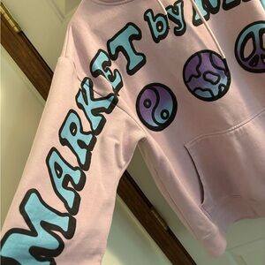 Market by Market lavender unisex hoodie with funky graphic print. 80% cotton, lined drawstring hood, kanga pocket, rib trim size M. Excellent used condition! Pit to pit no stretch: 24.5”