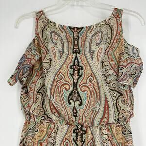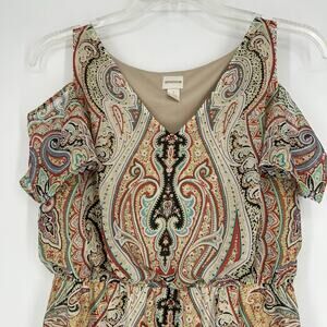 Chicos 1 Size M Boho Maxi Dress Cold Shoulders Beige Paisley Whimsical Colorful