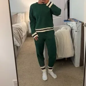 Cozy green sweater and pants set featuring stylish striped accents on cuffs and hem.
