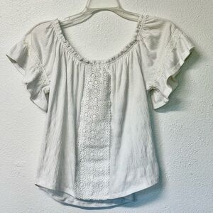 The Arizona Jean Company presents a charming white blouse featuring flutter sleeves and a smocked neckline. Off the shoulder option. I am 5’4, 130lbs, 36B for reference.