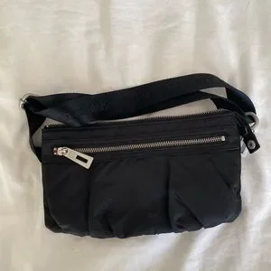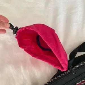 Great for travel. Adjustable strap. Black nylon on the outside and bright pink on the inside. Several inside pockets and an outside zipper pocket too.