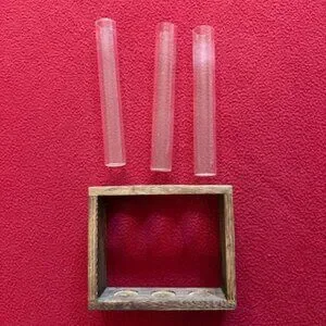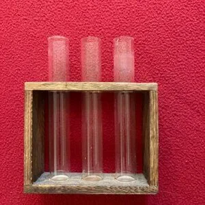 Add a touch of vintage charm to your home or office with this wooden test tube holder complete with 3 clear glass test tubes. Perfect as rustic farmhouse decor, a quirky vase set for small flowers, or as a collectible science-inspired display piece.