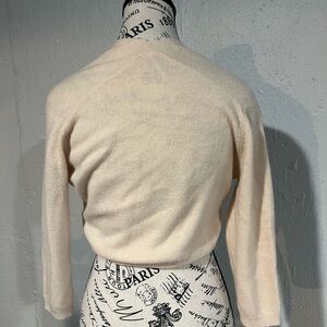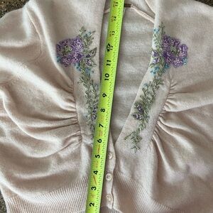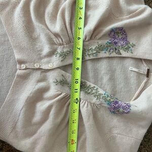 This Free People cardigan shrug sweater features a soft cream knit with delicate purple embellishments around the neckline. Its comfortable fit and classic design make it a versatile addition to any wardrobe, perfect for layering in cooler weather. Elegant yet playful this piece works over a cocktail dress, wedding guest dress or with jeans. See measurements in photos. Sized medium