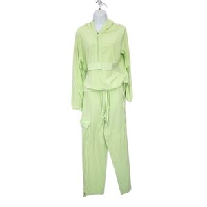 The STAN HERMAN Hooded Velour Lounge Set in size medium includes a 1/2 zip jacket and pants, perfect for travel, activewear, or casual occasions. Made from a blend of polyester and cotton, the set features a solid lime green color, long sleeves, and an elastic waist for comfort. The versatile set is suitable for all seasons, with a hooded jacket and pullover closure for added style and convenience. Perfect for the modern woman looking for a comfortable and stylish tracksuit for everyday wear.