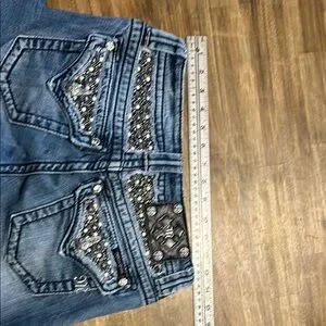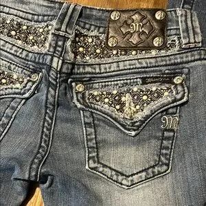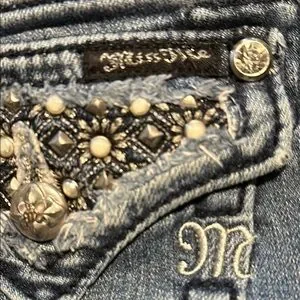 These Miss Me jeans showcase a stunning blue hue with intricate embellishments that add a touch of elegance.