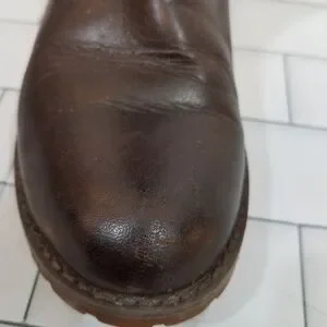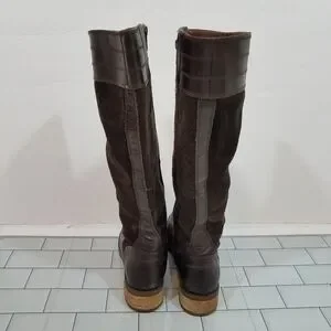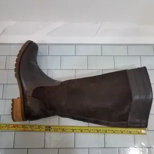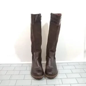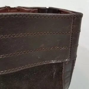 Suede and leather. See pics for measurements. Some scuffs on toes and heels. Zipper closure. Soles are clean. White residue on top of boot and indent, no puncture.