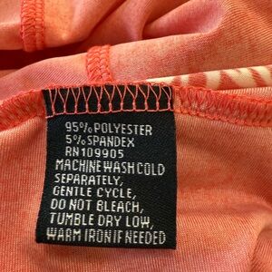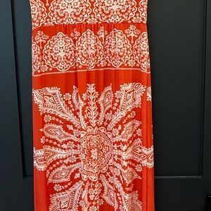 Vibrant red-ish orange and white patterned maxi dress. Has very light layer of padding in the bodice. Gently used in great condition!