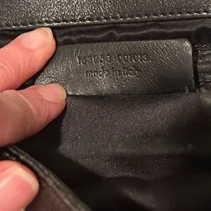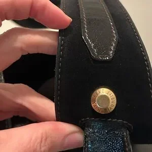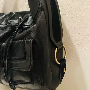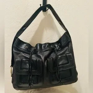 See all pictures. This elegant black leather suede shoulder Tote bag is perfect for any occasion. Its sleek design and spacious interior make it a must. Made in Italy ๐ฎ๐น. Call out one gold brad missing see pics completely functional in great condition. Amazing must have staple piece for your wardrobe collection. Dimensions Aprox 16.5 W 11.5 H 5 D Strap 9โ drop. Serial number 163953โข001013