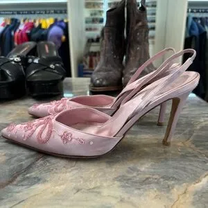 I wish these fit me OMG! Vintage kitten heel sling back. With the pink beaded embroidered used but still so adorable