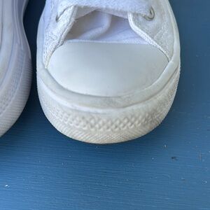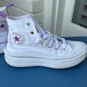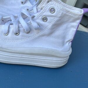 Classic platform Converse high-tops in white with lavender details. Comfortable and stylish for everyday wear. In good used condition