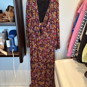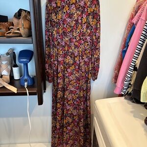 Step into casual elegance with this Buddy Love gown, featuring a striking red and pink palette. The dress boasts a ruffled, tiered design with long bishop sleeves and a plunging neckline, perfect for resort wear. Its flowing silhouette and light fabric ensure comfort and style for any relaxed occasion.