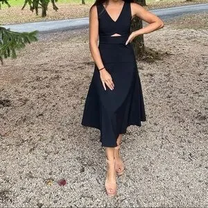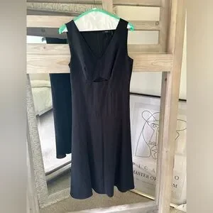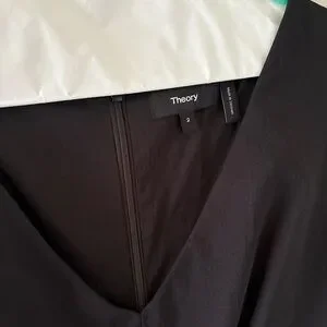 This sophisticated black sheath dress by Theory is perfect for a cocktail night out. Featuring a sleeveless design and a flattering V-neckline, it offers a sleek and modern silhouette. The midi length adds a touch of elegance, making it a versatile choice for any upscale occasion.