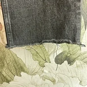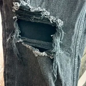 Barely worn, like-new jeans with distressed knees and frayed hem. Crafted from a medium to heavy weight denim, they provide a comfortable fit that reaches the ankle. There is a little bit of stretch to these but not much.