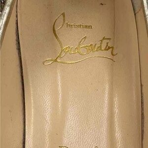 These Christian Louboutin gold heels are a luxurious addition to any formal ensemble. Crafted with a sophisticated silhouette, they feature a stunning gold finish that exudes elegance and style. Perfect for special occasions, these heels are designed to make a statement.
