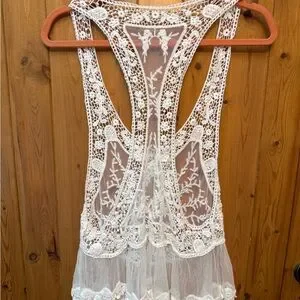 This elegant white lace swim coverup is perfect for a day at the beach or poolside lounging. Its intricate design adds a touch of sophistication to your swimwear ensemble. Bought at a boutique while on vacation- never worn