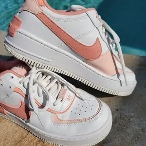 Excellent pre owned condition Nike Air Force 1 Shadow womens leather sneakers in summit white, washed coral and pink quartz. Hands down the cutest Nike sneakers!! Excellent pre owned condition. Size 8