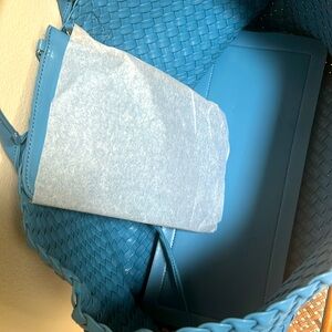 Urban Expressions blue vegan leather diamond weave tote bag, great for summer into fall. Spacious and soft, the bag measures 16” across the bottom and is 12” tall. Two handles. There’s an attached interior zippered pouch which measures 6x10”. Great quality. Never used.