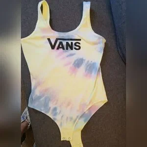 This vibrant Vans bodysuit features a striking blend of yellow and pink hues, perfect for making a statement. The classic tank-style cut ensures comfort and style, while the prominent Vans logo adds a sporty touch. Ideal for any casual outing, this one piece combines fashion and function effortlessly.