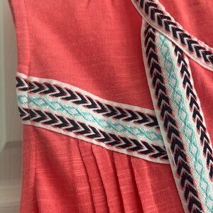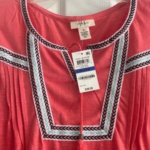 This vibrant coral sleeveless blouse from Style & Co features a chic bib collar and a stylish tie front. The pleated design adds a touch of elegance, making it perfect for warm weather outings.