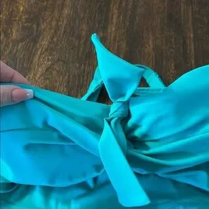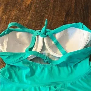 Stylish teal bikini/ Tankini top. Features a bow detail. Perfect for summer. Gently used. Push-up/ underwire. No padding. Removable/ adjustable straps. Smoke free/pet friendly home.