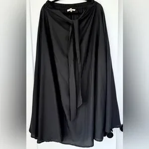 This black maxi skirt features a classic A-line silhouette and a stylish tie front, perfect for both work and cocktail occasions. Its flowing design and floor-length cut offer a sophisticated look, while the lustrous fabric adds a touch of elegance.