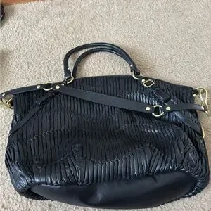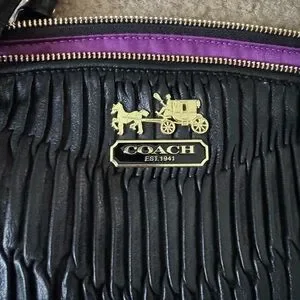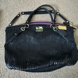This Coach shoulder bag in black features a sophisticated pleated design, offering a chic and modern look. Crafted with a glossy finish, it includes metallic hardware and a top zipper closure, making it both stylish and functional. Its medium size and structured silhouette make it a versatile accessory for any occasion.