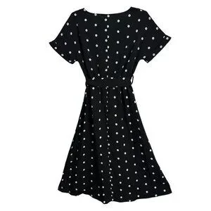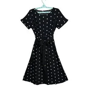 Black Polka Dot Button-Skirt Belted Midi Dress Business Career Academia SZ M