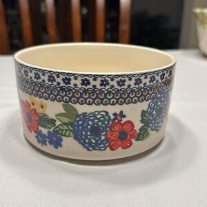 This is a preowned “ The Pioneer Woman” dazzling dahlias stoneware bowl. Features red, blue, and green flowers with intricate detailing. It measures 3” high & 6” diameter. Mint condition.