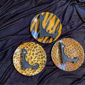 Animal Skin 6” Saucers with Stands, featuring tiger, giraffe, and leopard patterns. Perfect for adding a wild touch to your table setting or styling.