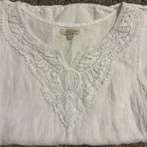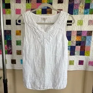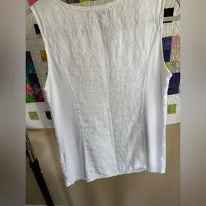 Elegant white sleeveless top featuring intricate lace detailing. Perfect for a chic and timeless look.