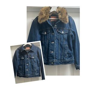 Levi's jacket in classic blue denim. Features a brown faux fur collar. Button-up front design.
