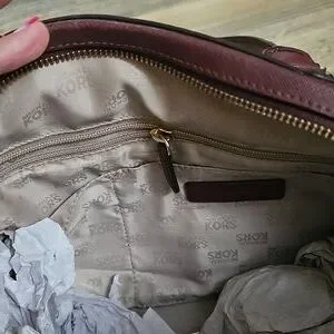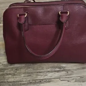 This Michael Kors satchel showcases a sophisticated design with its rich burgandy leather and striking gold-tone embellishments. The structured silhouette and dual top handles make it a versatile accessory for any occasion. Its elegant combination of classic and modern elements ensures it stands out in any setting.