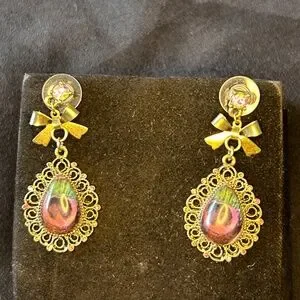 Adorned with a bow under the cubic zirconia stone. Inside there is a picture of a peacock feather.