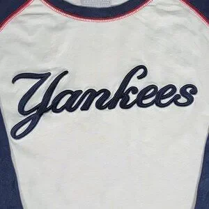 Step up to the plate in style with this New York Yankees navy and white raglan sleeve tee! Featuring 3/4 sleeves, embroidered "Yankees" text and the NY logo on the left sleeve.