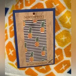 New with tags , 2 totes and 2 towels and wristlet- black and white striped tote and wristlet, straw beach bag with blue logo trim , 2 towels by north point 1 flip flop print and 1 pineapple print