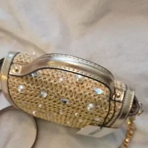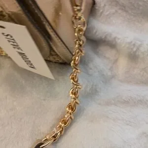These Steve Madden mini bags feature a stunning gold and tan color palette, perfect for adding a touch of glamour to any outfit. The structured design and intricate woven texture make them a standout accessory for evening events. With their compact size and elegant chain straps, these bags are both stylish and functional.