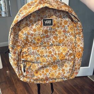 Vans backpack with a floral pattern. Features orange and yellow flowers. Stylish and functional.