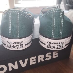 Green canvas sneakers with white laces. Iconic Converse style.