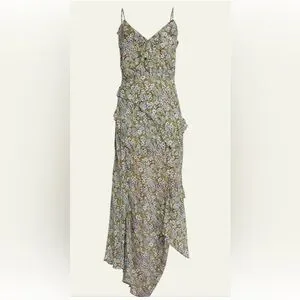 This stunning airy slip dress crafted in luxurious silk showcases a ditsy daisy print! Featuring ruffles cascading across the neckline and down the bodice, a thigh-high side slit, an asymmetrical hem, and adjustable spaghetti straps for an effortlessly chic and flattering style.