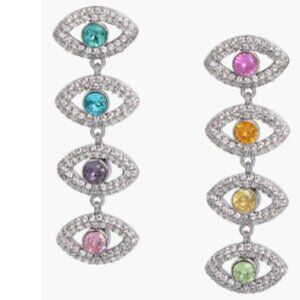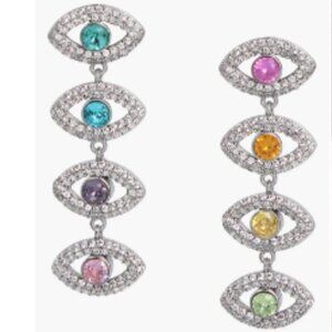 Evil-eye stations shimmering with vibrant crystals and pavé cubic-zirconia stones are suspended from these linear drop earrings that add instant glam to your everyday attire.