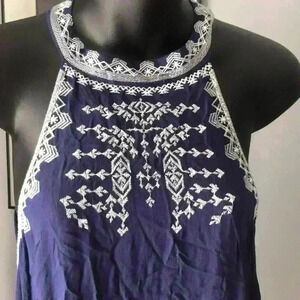 Like new blue halter dress with pockets white embroidery on front around neck cute tie back