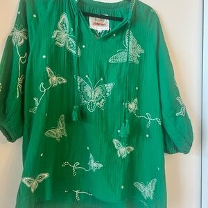 This Johnny Was blouse showcases a vibrant green hue, offering a boxy and relaxed silhouette for ultimate comfort. The top features a unique design that effortlessly combines style and ease, making it a versatile addition to any wardrobe.