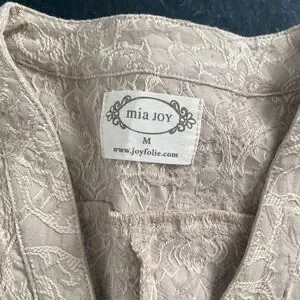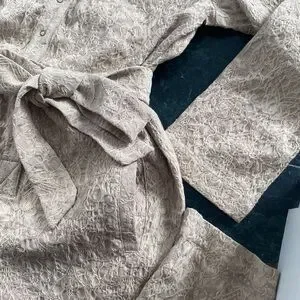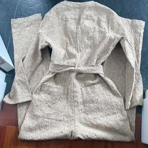 Elegant tan jumpsuit with textured fabric. Features a tie waist and button front. Long sleeves for versatile styling.