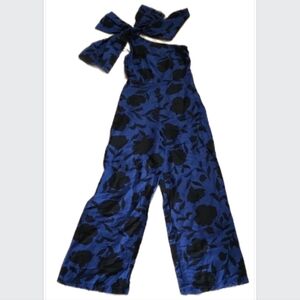 Kate Spade x Target collaboration jumpsuit in a bold blue coastal-inspired print with a chic one-shoulder ruffle neckline.