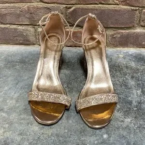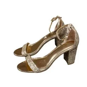 Step out in style with these stunning gold glitter heels. Perfect for any special occasion.