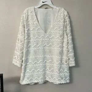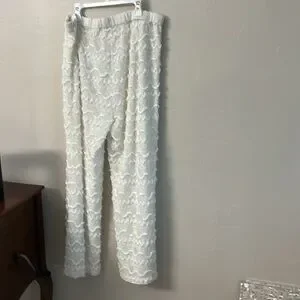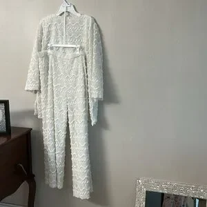 Indulge in the luxurious comfort of the Ecru White Lace set. Crafted with delicate lace detailing, this set offers a soft and elegant touch for casual to elegant events . The flowing silhouette ensures a relaxed fit fully lines except for sleeves. Zipper on side of pants. Waist is 18” and inseam is 27”. Fabulous condition!