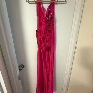 Elegant fuchsia satin dress with a stylish neckline. Perfect for special occasions.