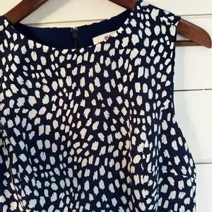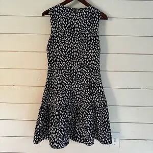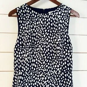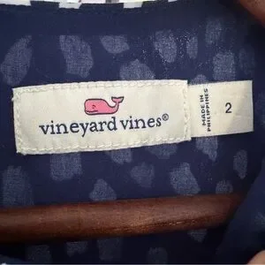 Vineyard Vines Painted Dots Sleeveless Dress. Size: 2. Chest (flat): 17 inches. Waist (flat): 14 inches. Length: 35 inches. Navy with white abstract dots. Sleeveless. Back zip. Fully lined. Tiered skirt. Great preowned condition