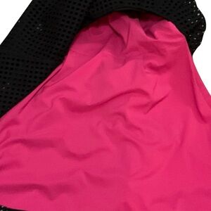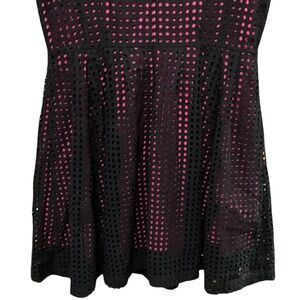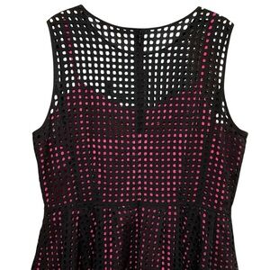 This sleeveless dress features a hot pink slip dress with a black cut out overlay, it is tapered at waist and has really fun pleats in the skirt.